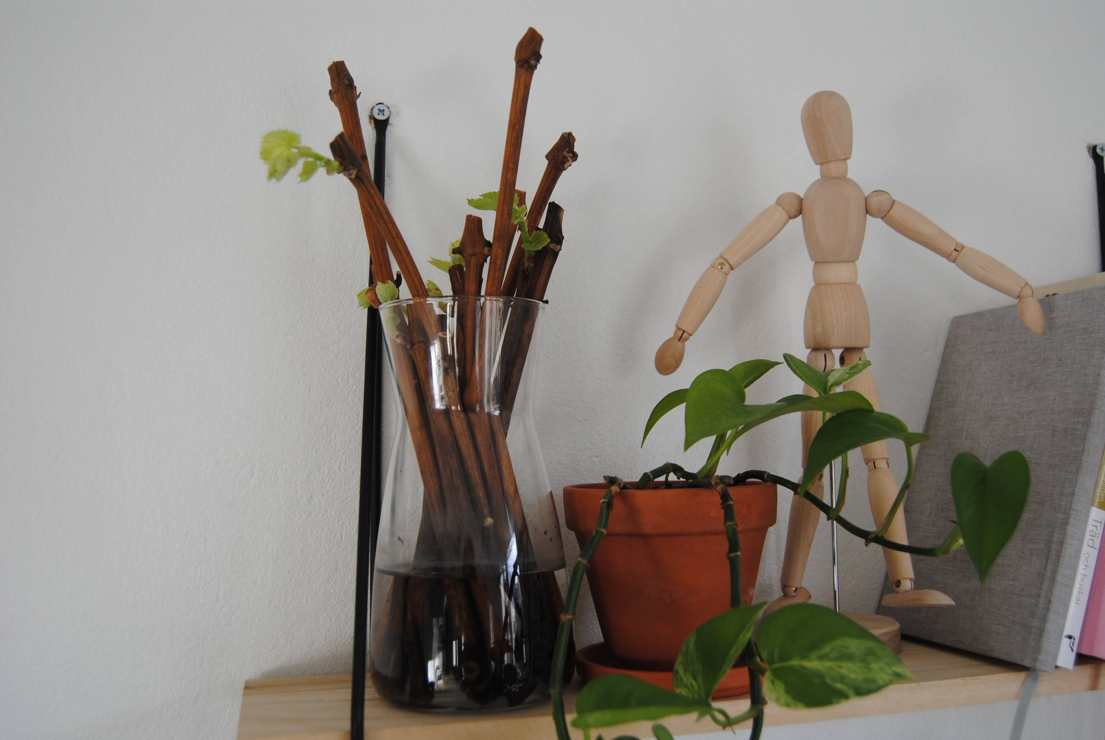 Vi får heller inte glömma de fina vinrankesticklingarna som just nu spirar grönt i vaser i min lägenhet! Det ger verkligen hopp om våren. Sticklingarna betyder även att jag gjorde årets nyårsbeskärning av vinrankan. Det har dock inte bildads rötter på sticklingarna än, men bladen tyder på liv!