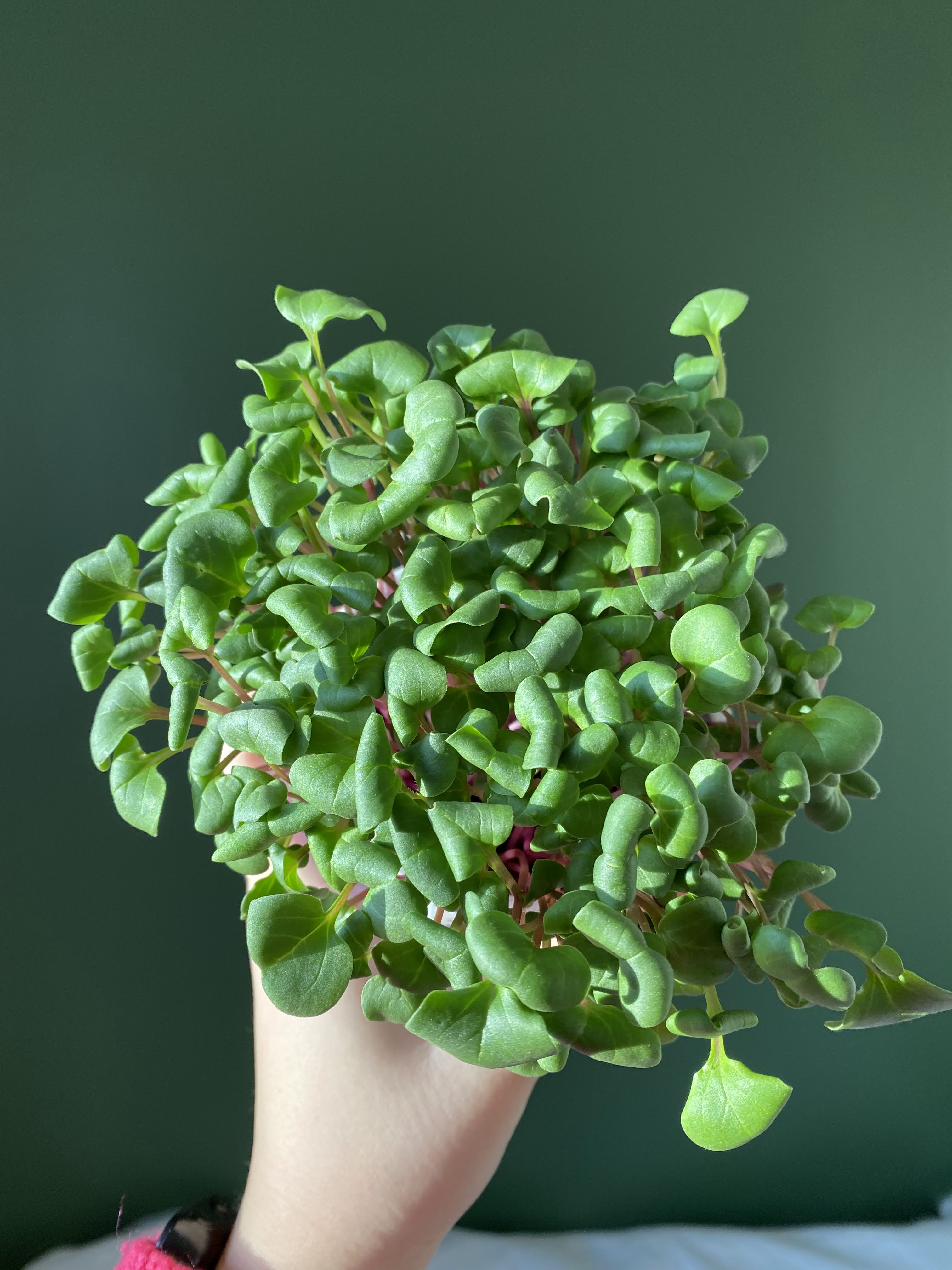 Rädiseskott som är odlat i en återanvänd gräddfilsburk!