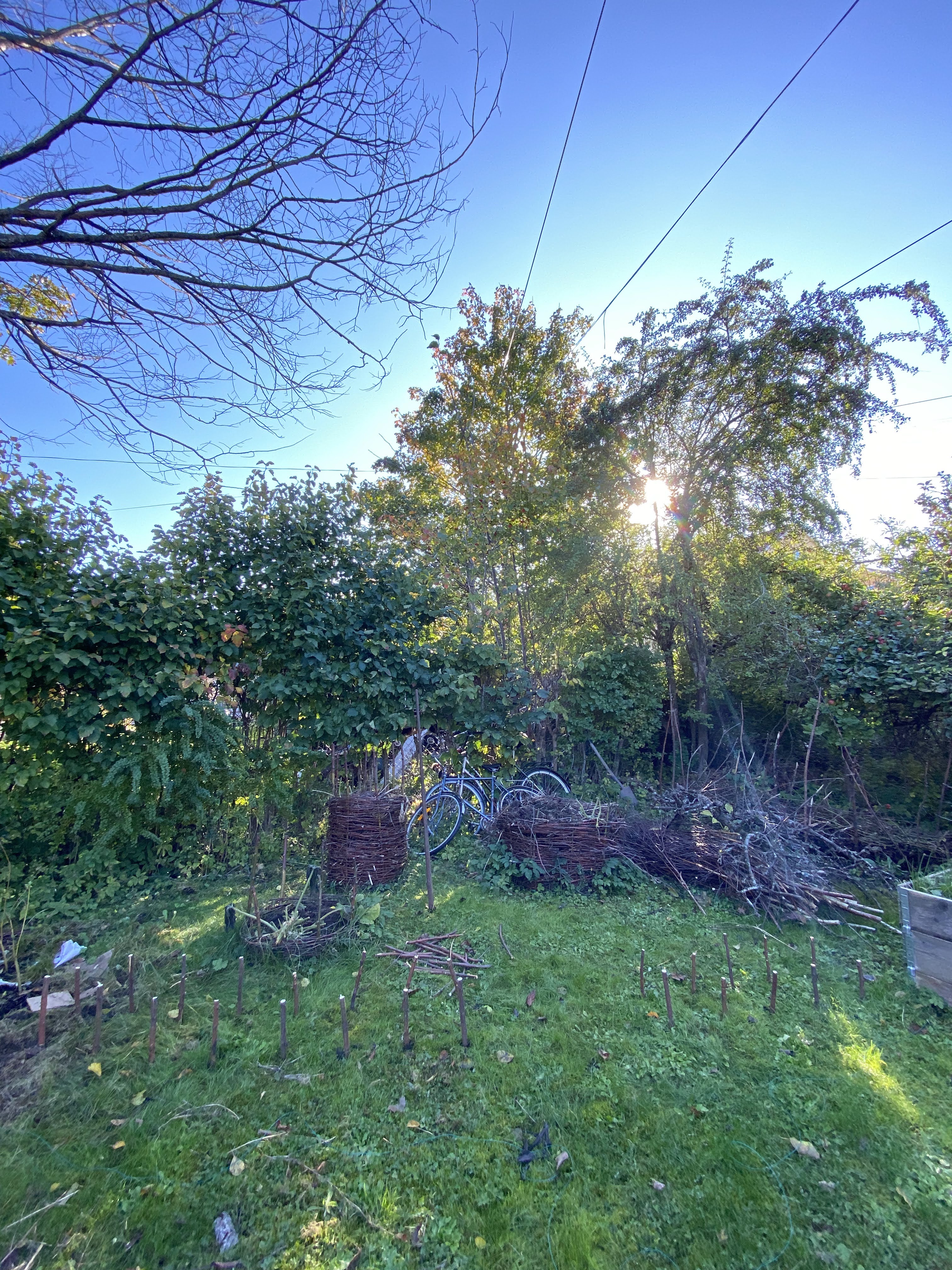 En utmaning som jag har haft med att ta tillvara på biomassan från trädgården är alla grenar som jag beskär. Jag tog till och med hit mina föräldrars grenar då de skulle åka till återvinningscentralen med dem. Det kunde jag inte acceptera… Med det sagt kan vi konstatera att jag har en hel den grenar. Jag har därför påbörjat att rama in det framtida wood-landet med ett lågt staket av pinnar. Så oktober har bjudit på mycket användning av sekatör och såg.