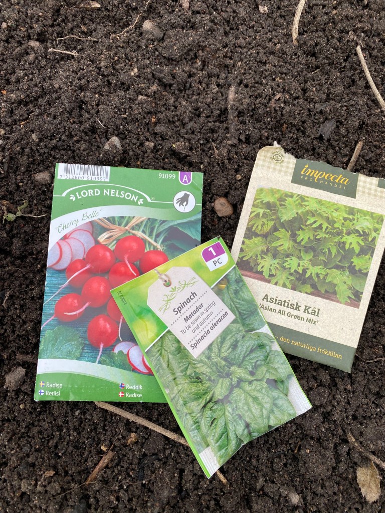 Under februari började jorden sakta men säkert att tina, iallafall på de översta lagerna. Då passade jag på att fortsätta att fylla krukor med kompostjord från den delvis tinade komposten, allt för att kunna börja så! Pallkragarna är även dem snabba på att släppa tjälen så i två av odlingslådorna sådde jag och min bror rädisor, bladkål och självklart spenat. Spenat är verkligen kungen när det kommer till kallsådd!