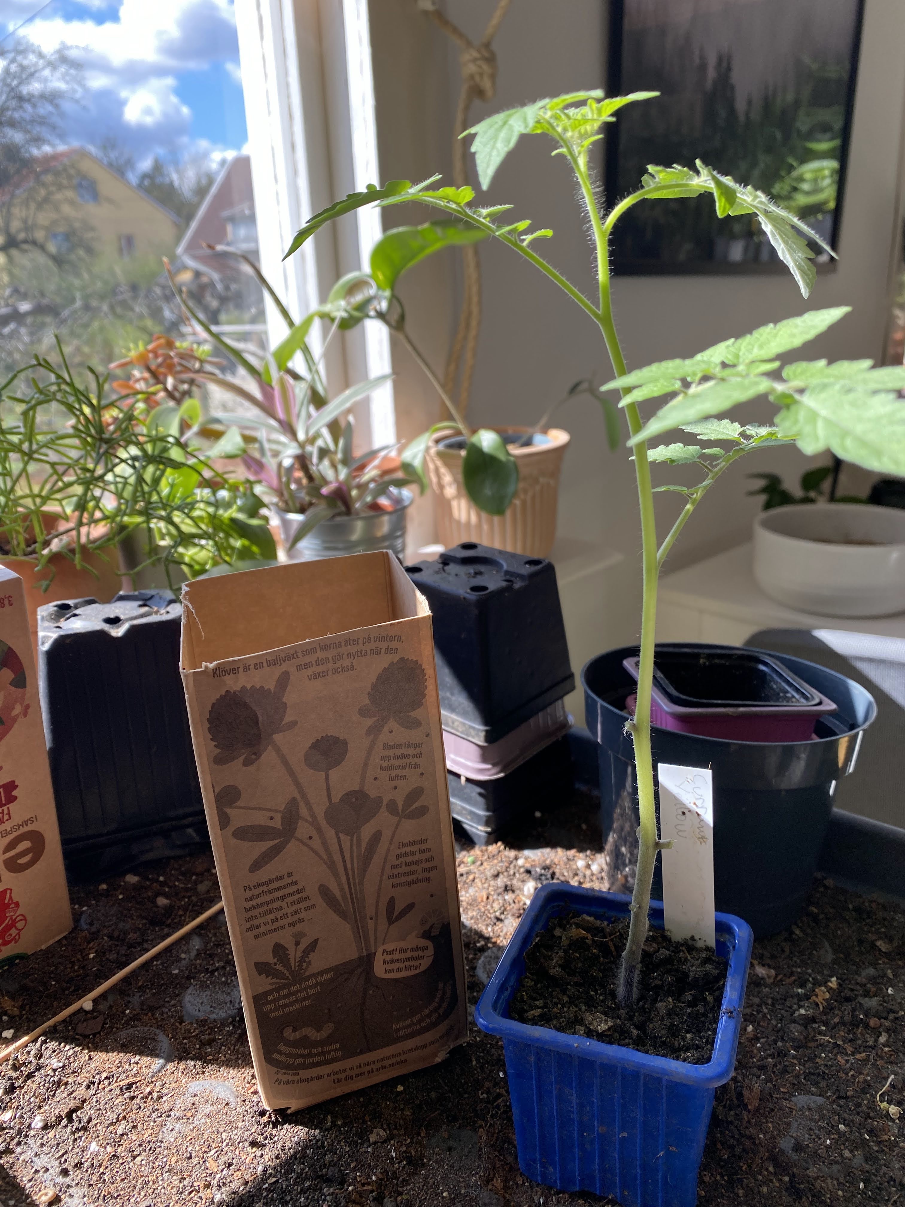 En annan fördel med att odla i mjölkpaket är att de tar väldigt liten plats. Eller det beror egentligen på hur många paket man odlar i. Men de är väldigt yt-effektiva att odla i eftersom att de är fyrkantiga! Många plantor på liten yta. Det finns en tendens på sociala medier att det alltid ska vara så himla fint när man förodlar inomhus. Nya krukor varje år och de ska helst vara likadana. Det kan absolut vara avgörande för mer storskaliga odlare att ha pluggbrätten och krukor i samma storlekar så att produktionen sker så effektivt som möjligt. Men för oss hobbyodlare behöver det inte vara så noga! Att ta det man har är perfekt! Speciellt när till exempel mjölkpaketen har fler fördelar än de runda ”vanliga” krukorna.